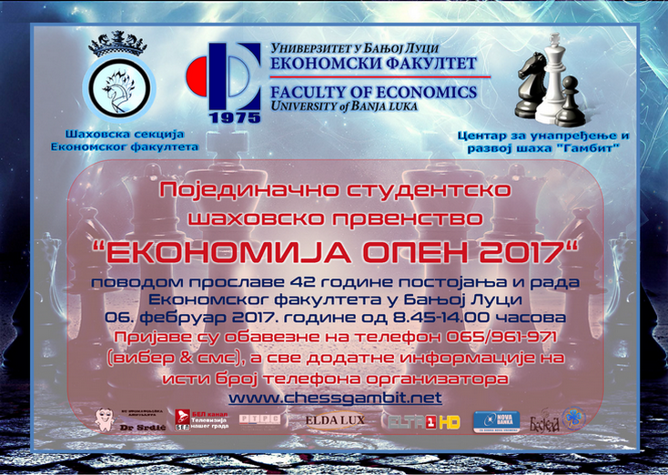 Centar za unapređenje i razvoj šaha "Gambit" iz Banje Luke organizacije sedmu godinu za redom šahovsku manifestaciju za studente Univerziteta i fakulteta u Banjoj Luci koja je posvećena proslavi dana Ekonomskog fakulteta. Ove godine Ekonomski fakultet proslavlja 42 godine postojanja i izuzetno uspješnog rada a tim povodom će biti organizovano Pojedinačno studentsko šahovsko prvenstvo "EKONOMIJA OPEN 2017".
