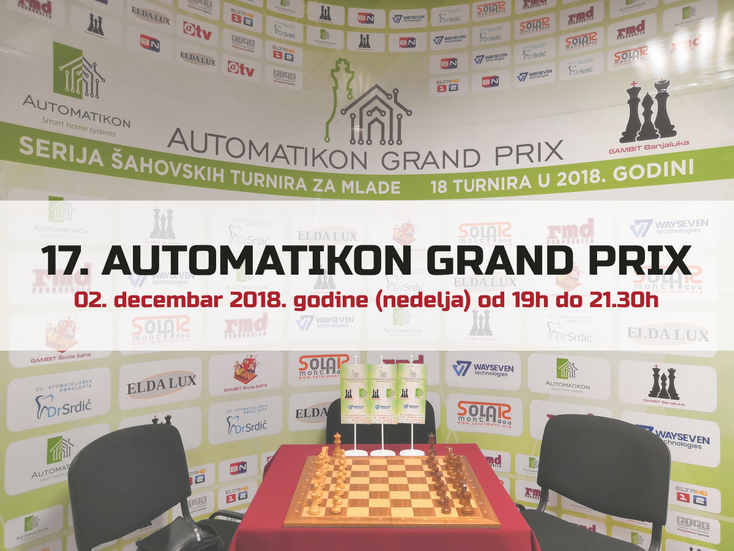 U nedelju 02. decembra 2018. godine (od 19.00h do 21.30h) slijedi 17. "Automatikon Grand Prix" u seriji šahovskih turnira za mlade koji možete pratiti uživo putem LIVE prenosa na našoj FB stranici: @gambit.banjaluka. U nastavku možete pogledati spisak prijavljenih učesnika kao i uslove za učešće na "Automatikon SUPER Grand Prix-u".