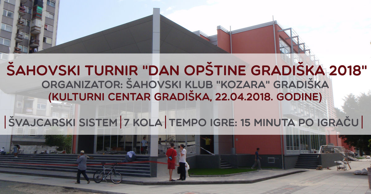 Šahovski klub "Kozara" Gradiška organizuje šahovski turnir "Dan opštine Gradiška 2018" 22. aprila 2018. godine (nedelja) u Kulturnom centru Gradiška. Turnir je rejtingovan kod FIDE za rapid rejting listu a biće odigrano 7 kola uz tempo igre od 15 minuta po igraču.