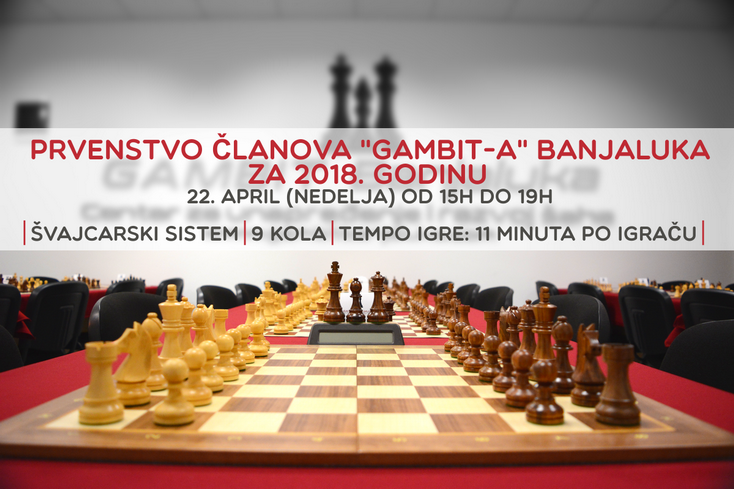 Prvenstvo članova-igrača Centra za unapređenje i razvoj šaha "GAMBIT" Banjaluka za 2018. godinu će ove godine biti održano 22. aprila od 15h. Turnir je po prvi put rejtingovan kod Svjetske šahovske Federacije - FIDE za rapid rejting listu a biće odigrano 9 kola po švajcarskom sistemu uz kompjutersko parovanje i tempo igre od 11 minuta po igraču za cijelu partiju.