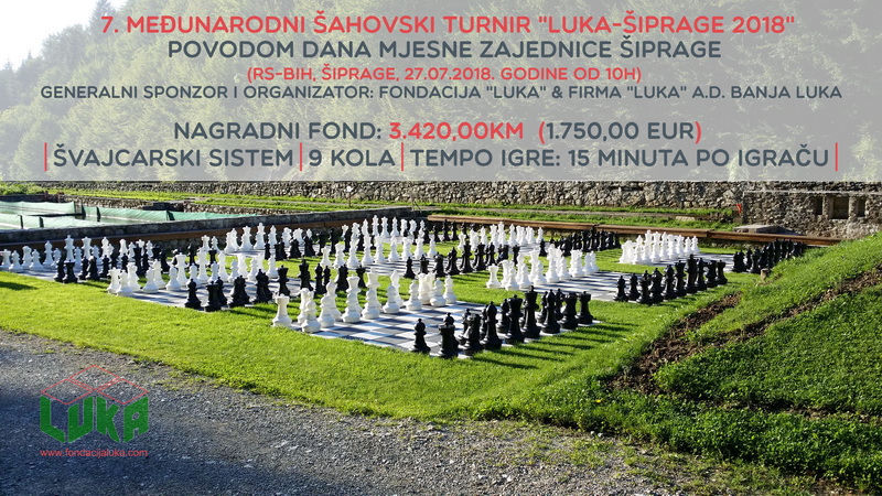Povodom Dana Mjesne zajednice Šiprage, i ove godine Firma "LUKA" a.d. Banja Luka organizuje tradicionalni 7. Međunarodni šahovski turnir "LUKA-ŠIPRAGE 2018". Kao i prethodnih šest godina, turnir traje jedan dan, a igra u petak 27. jula 2018. godine, sa početkom u 10.00 časova (potvrda prijave do 9.30h) u sklopu ambijenta domaćina PJ Ribnjak na lokalitetu sela Kerle, Šiprage, Opština Kotor Varoš.