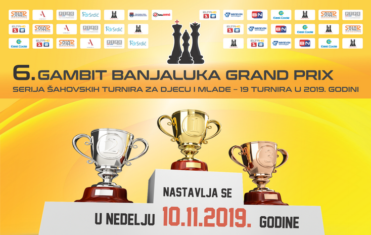 U nedelju 10. novembra 2019. godine nastavlja se 6. "GAMBIT Banjaluka Grand Prix" u seriji šahovskih turnira za djecu i mlade u okviru koje će biti organizovano 19 turnira u 2019. godini. U nastavku pogledajte i kako izgledaju ukupne tabele: