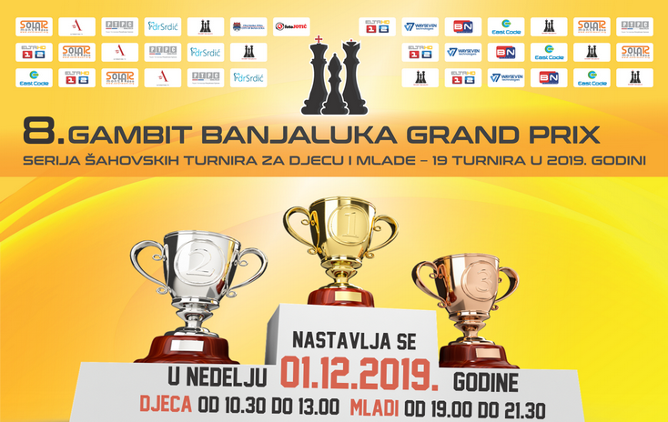 U nedelju 01. decembra 2019. godine nastavlja se 8. "GAMBIT Banjaluka Grand Prix" u seriji šahovskih turnira za djecu i mlade u okviru koje će biti organizovano 19 turnira u 2019. godini. U nastavku pogledajte i kako izgledaju ukupne tabele:
