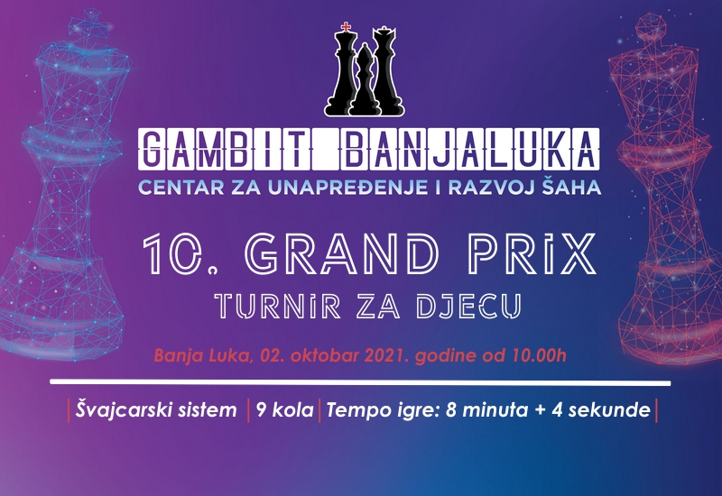 U subotu 02. oktobra nastavlja se 10. "GAMBIT Banjaluka Grand Prix" šahovski turnir za djecu, prvi u mini seriji turnira za 2021. godinu. Početak takmičenja je u 10h a zbog ograničenih kapaciteta sale, pravo nastupa imaju isključivo polaznici škole šaha "GAMBIT" Banjaluka koji se blagovremeno prijave.