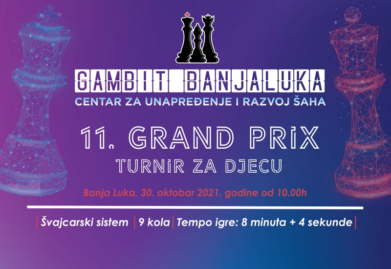 U subotu 30. oktobra nastavlja se 11. "GAMBIT Banjaluka Grand Prix" šahovski turnir za djecu, drugi u mini seriji turnira za 2021. godinu. Početak takmičenja je u 10h a zbog ograničenih kapaciteta sale, pravo nastupa imaju isključivo polaznici škole šaha "GAMBIT" Banjaluka koji se blagovremeno prijave i pozvani gostujući takmičari.