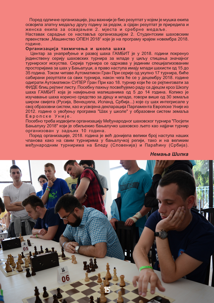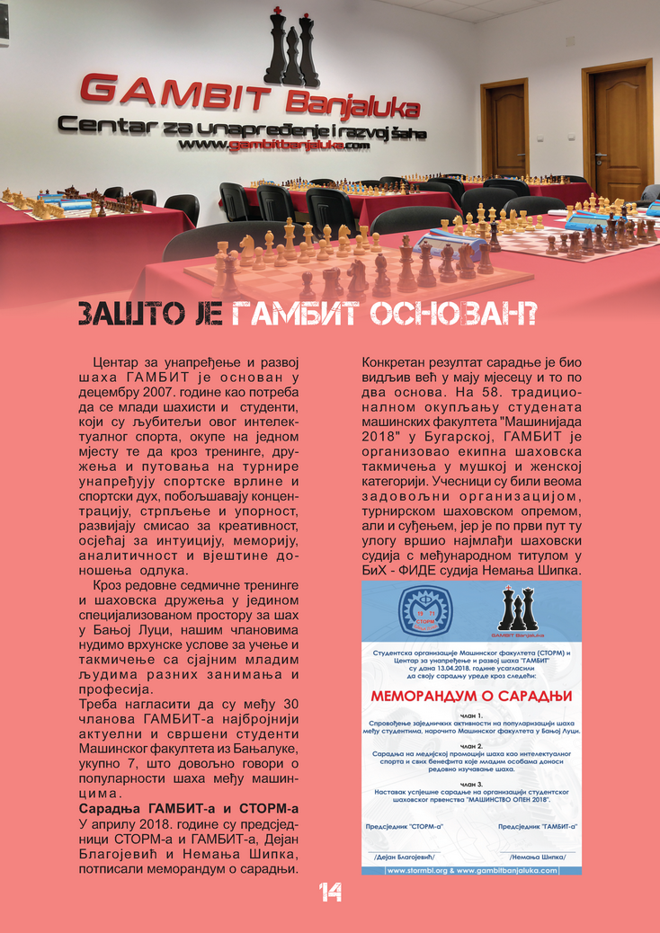 Dejan Blagojević - predsjednik "STORM-a" je naglasio da studenti Mašinskog fakulteta imaju dugu tradiciju sjajnih šahovskih rezultata, kako pojedinačnih tako i ekipnih, od kojih svakako treba naglasiti dvije godine za redom osvojena zlatna medalja na 57. i 58. tradicionalnim okupljanjima studenata Mašinskih fakulteta u Budvi (2017. godine) i Bugarskoj (2018. godine), uz sjajnu saradnju sa "GAMBIT-om" Banjaluka.