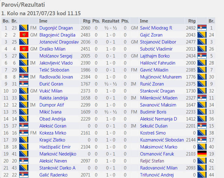 Danas je u Kotor Varošu počeo 3. Međunarodni šahovski OPEN turnir "PST - International Chess Tournament 2017". Nastupaju 44 takmičara iz 4 države od čega je čak 16 sa međunarodnim titulama (36%): 6 velemajstora (GM), 6 intermajstora (IM) i 4 FM. Završeno je prvo kolo koje je donijelo tri neočekivana remija.