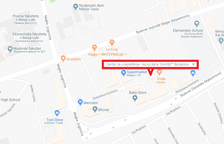 Upis novih polaznika u školu šaha "GAMBIT" je moguć svake sedmice u gore navedenim terminima. Sve dodatne informacije možete dobiti na broj telefona: 065/961-971 (Viber & WhatsApp) ili putem društvenih mreža: Facebook ili Instagram.