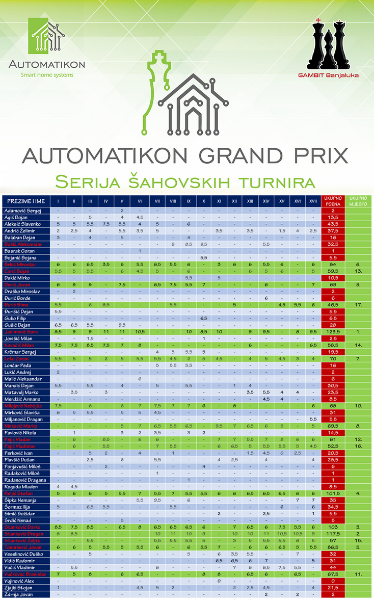 Kompletna tabela nakon 17 odigranih kvalifikacionih "Automatikon Grand Prix" turnira za mlade: